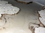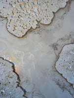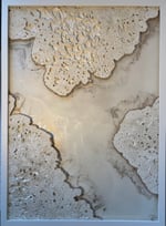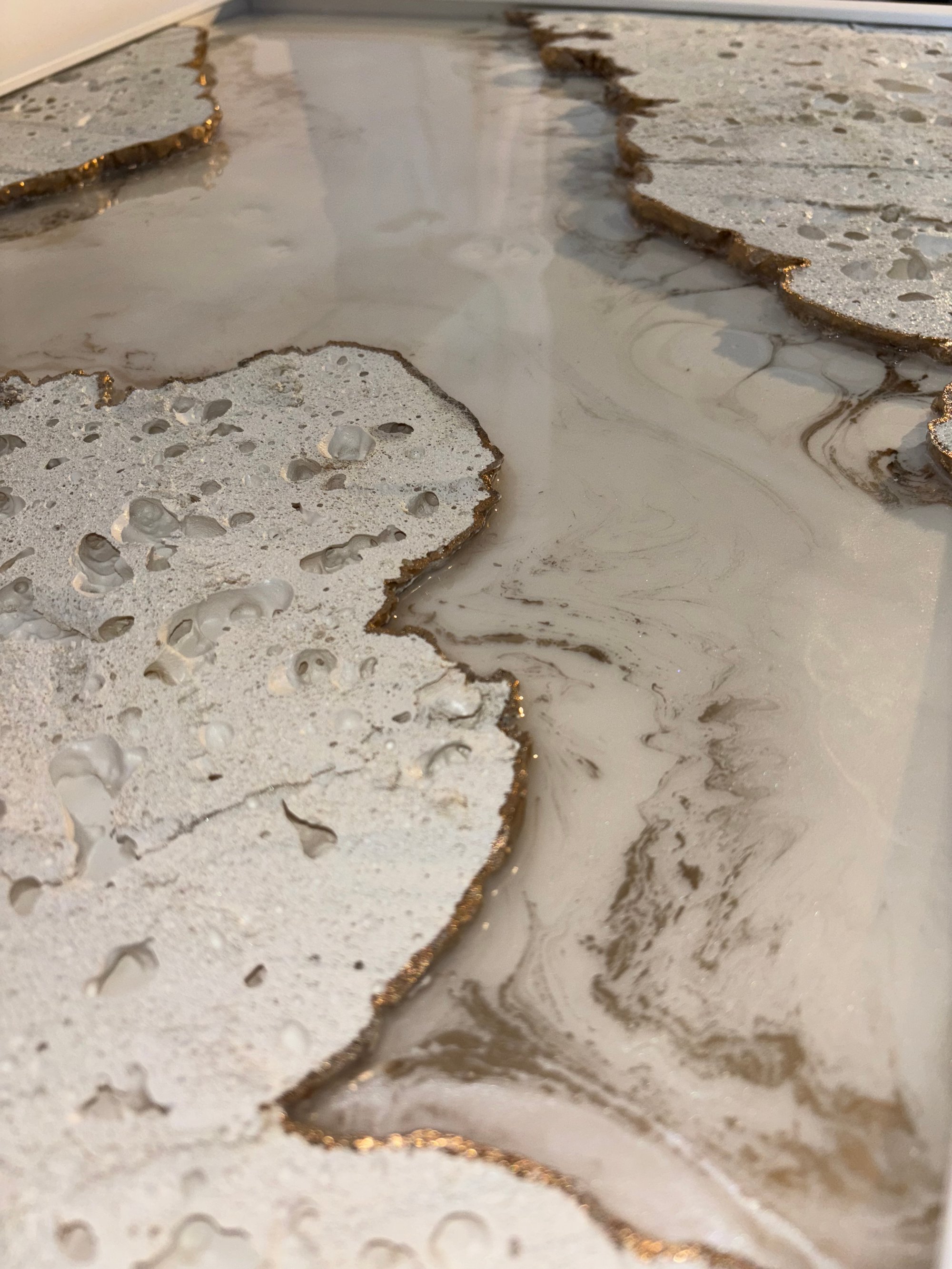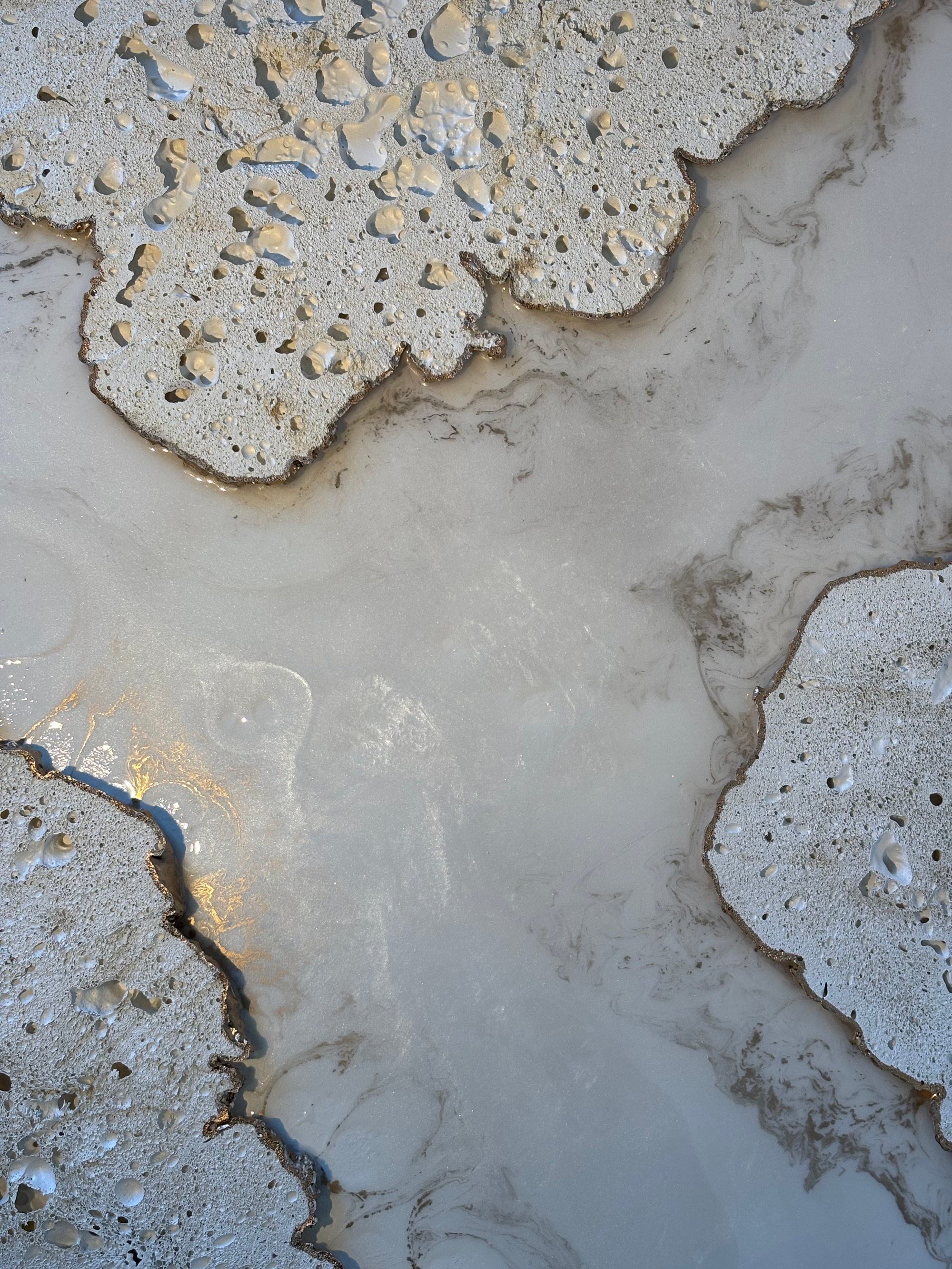 ’Golden Coastline’ is a riveting depiction of a coastal scene where molten lava meets the ocean, transforming into porous pumice stone. The polyurethane resembles the pumice stone as it hardens into a white stone. Along the coastline, a streak of radiant gold highlights the meeting point of land and sea. The interplay of textures-rough pumice-like polyurethane, glossy resin, and gleaming gold-captures the dynamic beauty of nature’s raw and fluid elements.