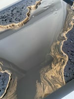 ’Molten Gold Coast’ is a mesmerising painting of a coastal scene where molten lava meets the ocean, transforming into vibrant igneous rock. The golden hues of the coastline shimmer under a surreal twilight, evoking an ethereal warmth. The polyurethane texture resembles the crystallisation process of molten lava as it solidifies into rugged, black rock. Hints of metallic gold and bronze streak through the coast, symbolising the fiery journey from liquid magma to solid earth.