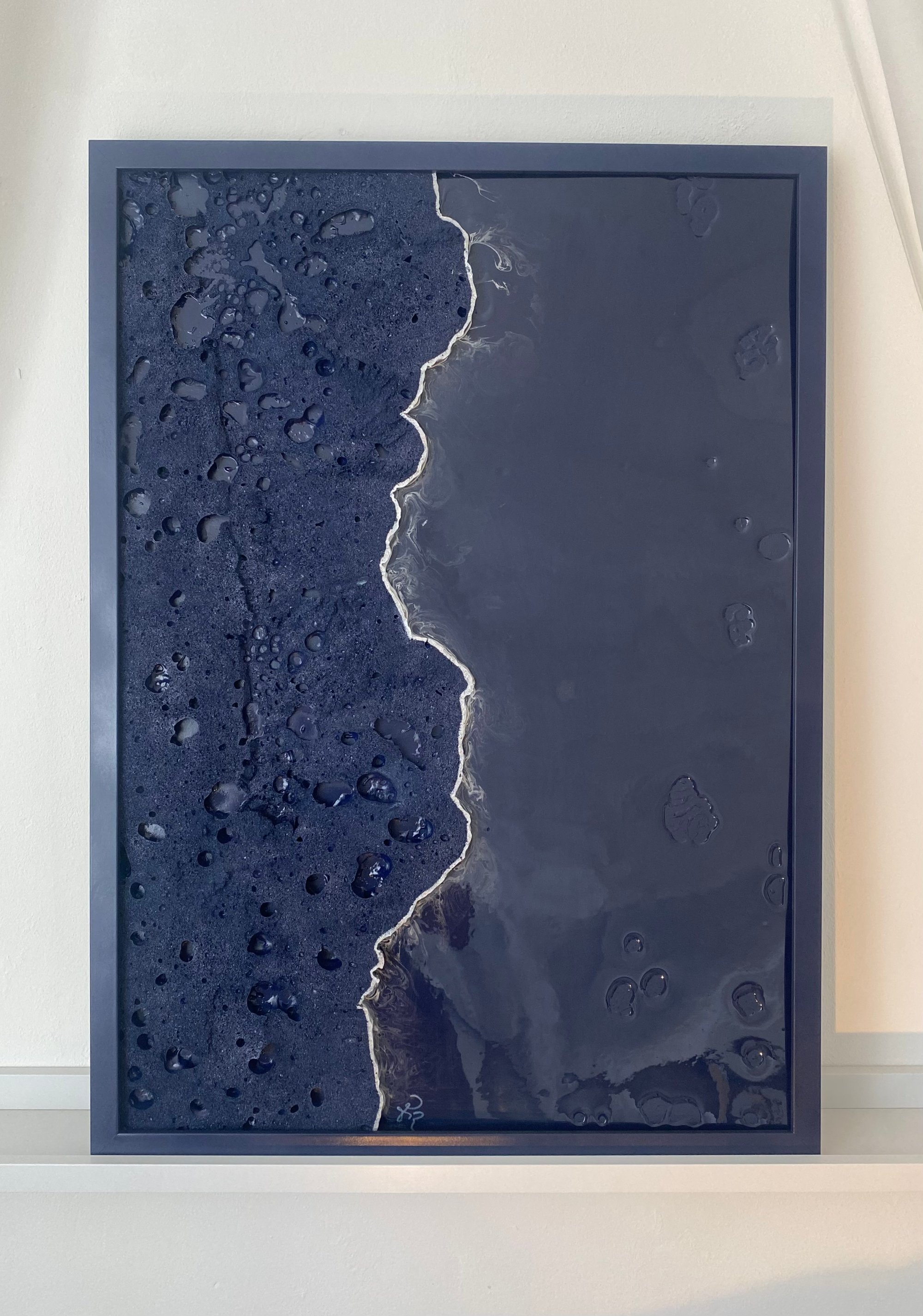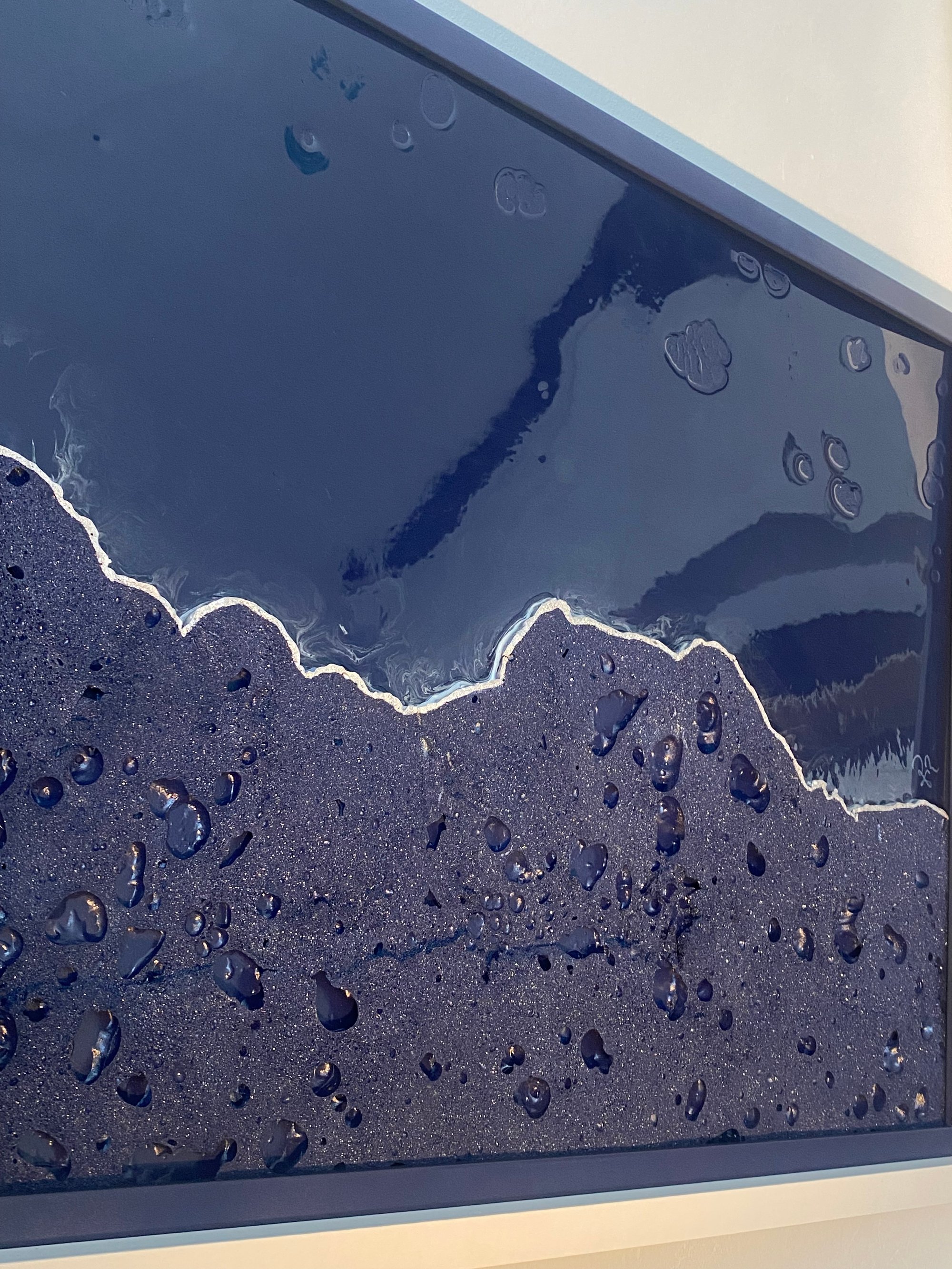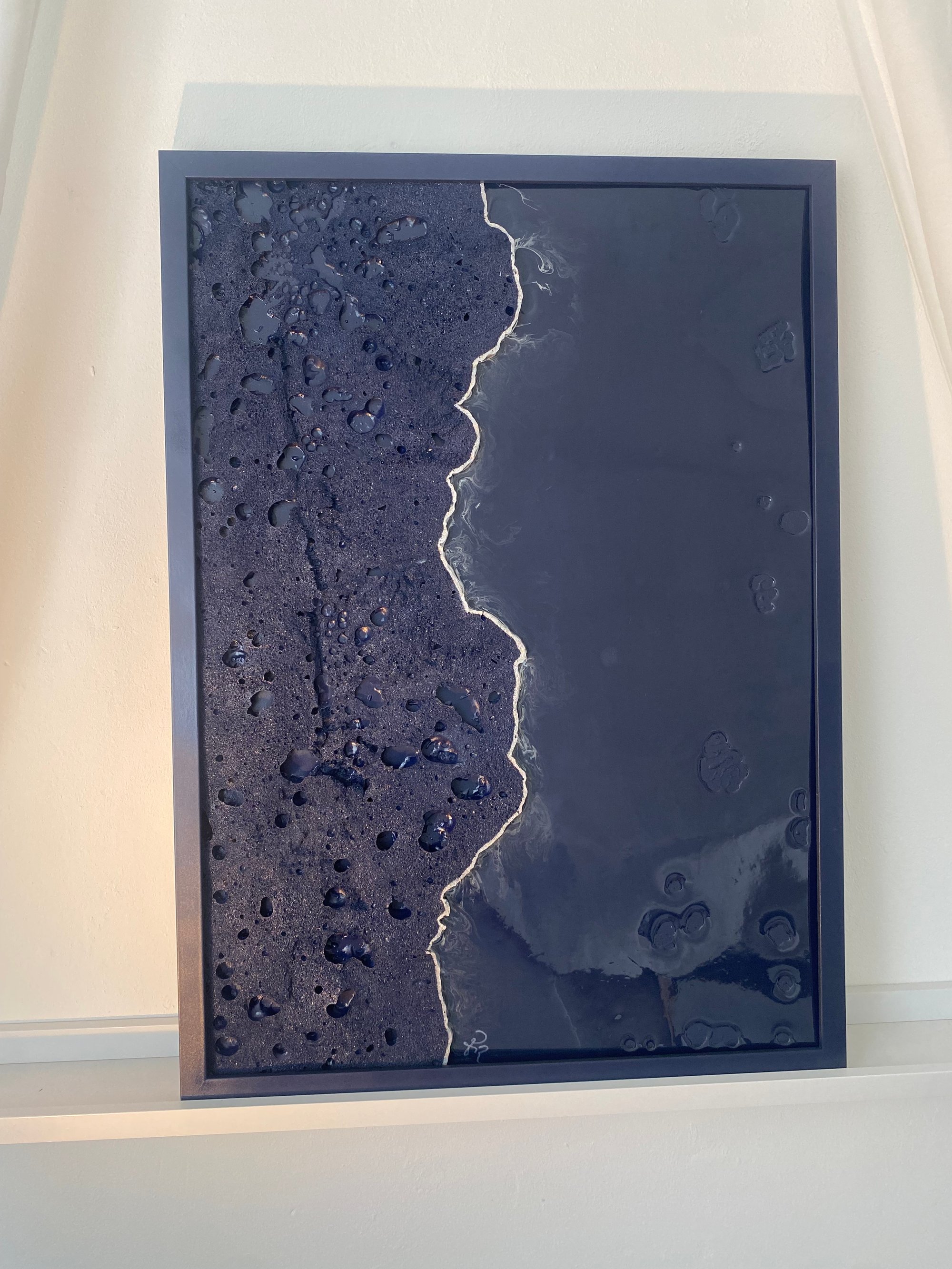 “Moonlit Shore” is a breathtaking mixed-media artwork that captures the ethereal beauty of a serene coastline under moonlight. The piece blends contrasting yet harmonious materials, creating alluring interplay of texture and light.